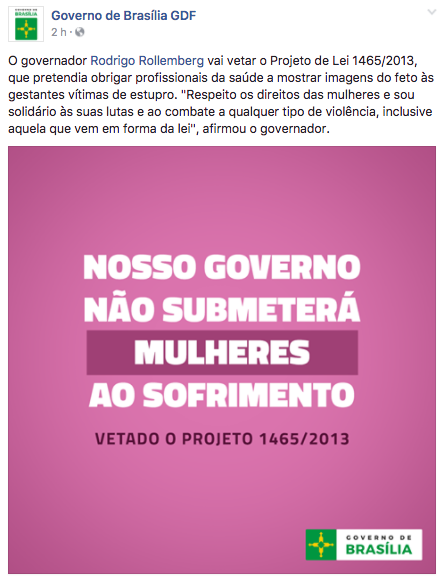 Depois de receber mais de 6 mil emails em menos de 24 horas, o governador Rodrigo Rollemberg (PSB-DF) comprometeu-se publicamente a vetar o PL 1465/13 de maneira integral! Até a página oficial do Governo do DF fez questão de declarar que este governo "não submeterá mulheres ao sofrimento". Na prática, ele pode publicar o veto até dia 17 de julho, mas não deve demorar muito até que a decisão se torne oficial.